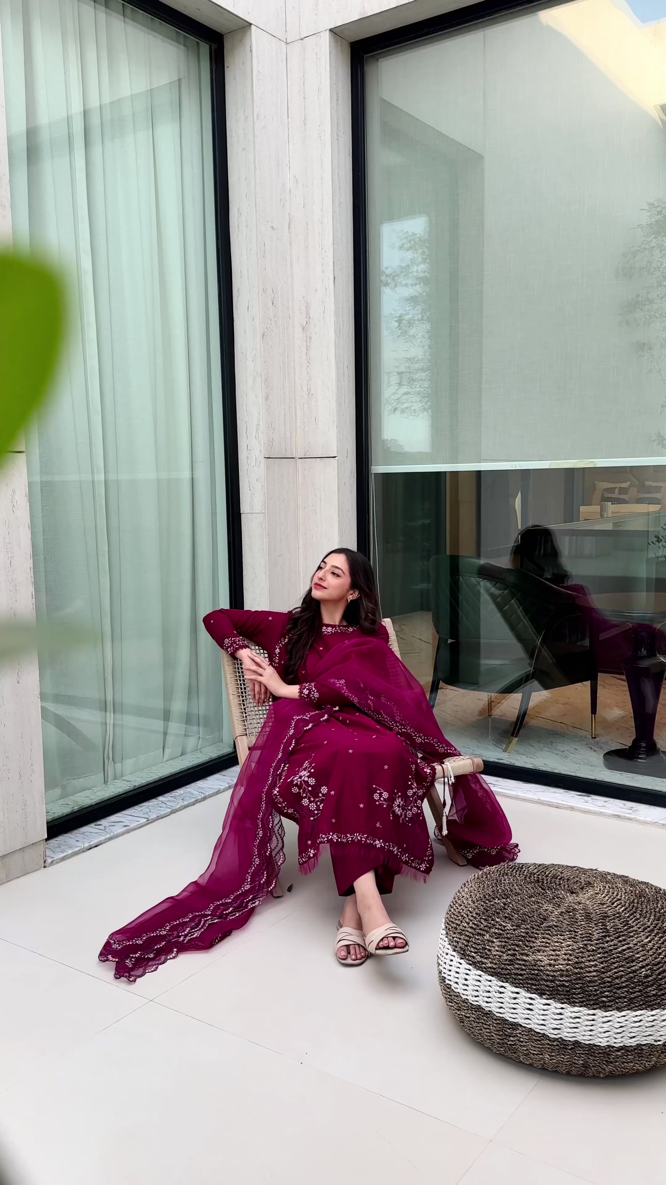 Lyra speaks of understated sophistication. This plum toned 3-piece dress features a gracefully cut long shirt, with detailed side panels, comes with organza dubatta, and tailored pants. Elegant enough for gatherings.